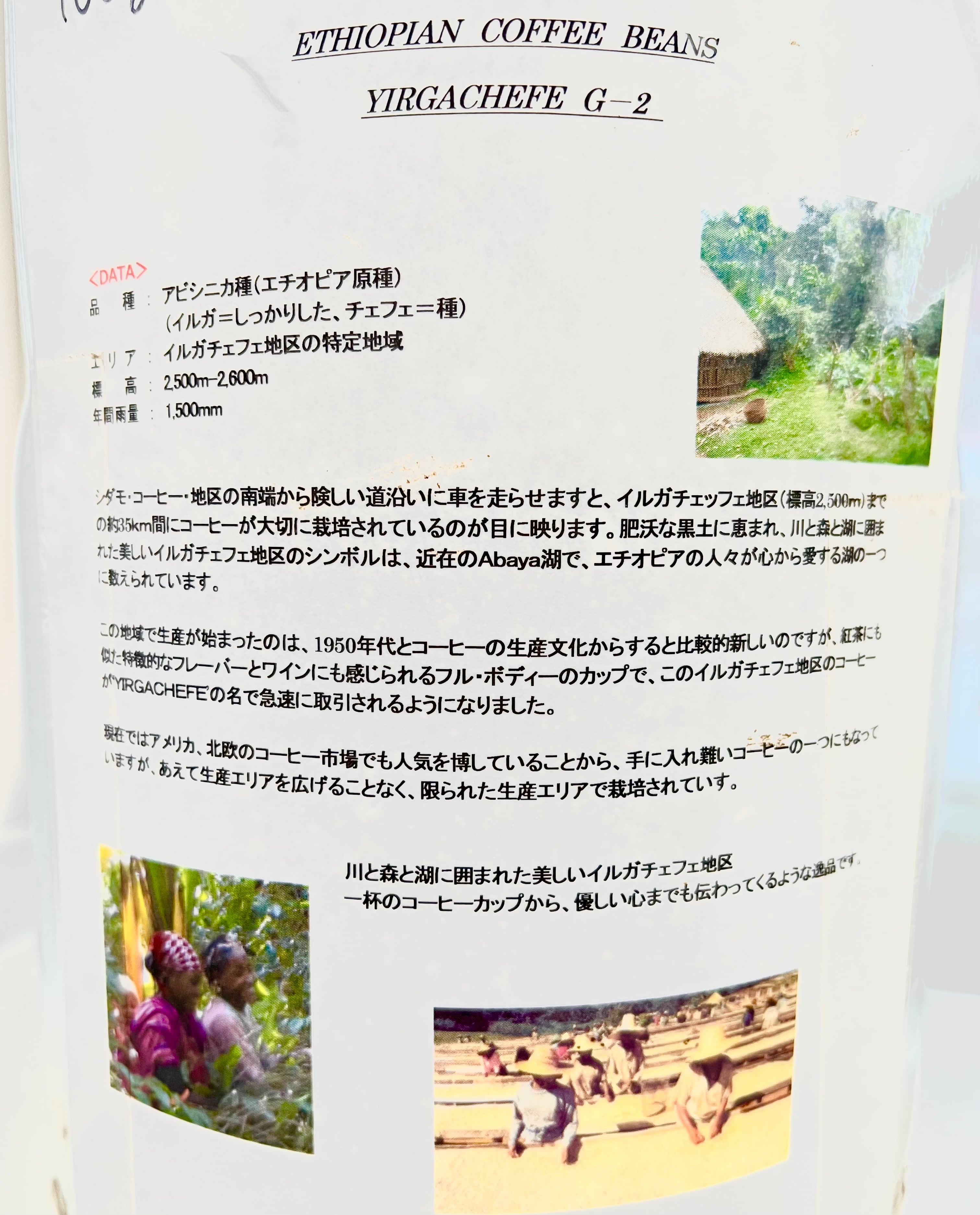 エチオピアコーヒーの中で最もその品質が高く評価されている中の一つYIRGACHEFFEのコーヒー。YIRGACHEFFEが収穫されるのは1800〜2000Mの標高にあり、YIRGACHEFFE地域の中でも最も標高が高い地域です。また、高い標高に加え土壌の条件が優れた地区で、コーヒーの栽培には最も適した地区であるということが言えます。